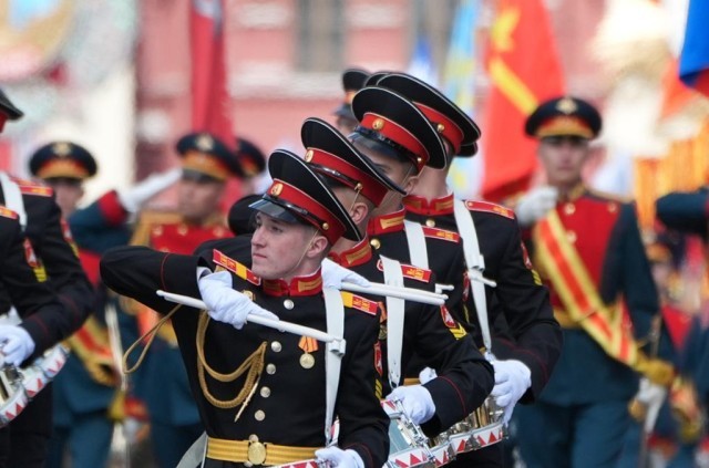2025年5月9日,在俄罗斯首都莫斯科,军乐队参加纪念苏联伟大卫国战争胜利80周年阅兵式。新华社记者 赖向东 摄