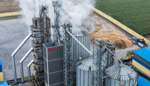 10月11日,在山东省东营市广饶县李鹊镇一处粮食收储企业,大型烘干设备在烘干秋粮。新华社发(刘云杰摄)